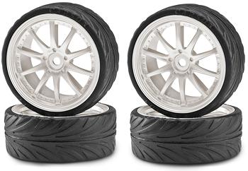 Carson Wheels #500900157 Design: Y-spoke Rim colour: black Hard-plastic tires, glued Width: 26 mm / diameter: 62 mmOffset: 3mm Drive: 12 mm hex Content: 4 complete wheels, scale 1:10